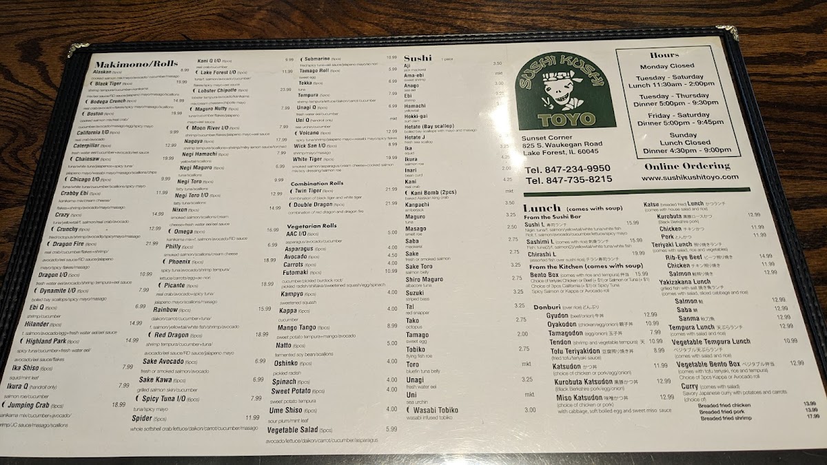 Welcome to Sushi Kushi Toyo, a gem nestled in the heart of Lake Forest, IL, where tantalizing sushi and delightful Japanese cuisine take center stage. Located at 825 S Waukegan Rd, this sushi restaurant is a haven for both sushi enthusiasts and casual diners alike. With its inviting atmosphere and a menu that embodies the essence of authentic Japanese flavors, Sushi Kushi Toyo is an experience that simply cannot be missed.
